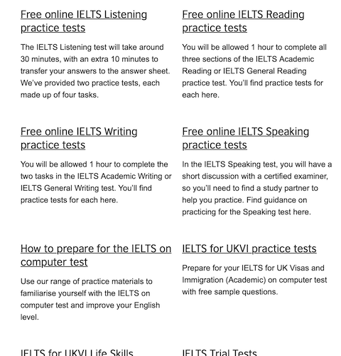 - 本番のIELTSに近い形式・レベルのサンプル問題を無料体験できる